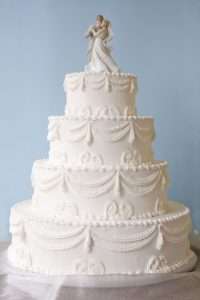 Una torta tradicional y elegante, típicamente blanca, con detalles de encaje comestible y decoraciones sutiles. Esta torta es perfecta para bodas formales.