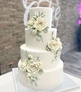Una torta elegante y sofisticada, cubierta completamente de fondant. Esta cobertura lisa permite crear diseños detallados y personalizados, como flores de azúcar, encaje comestible, o figuras de los novios.